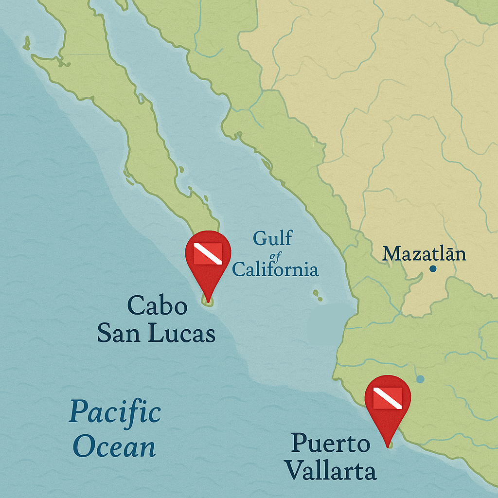 Ubicado donde se unen el Mar de Cortés y el Océano Pacífico, Cabo San Lucas ofrece buceo accesible, diverso y con una increíble mezcla de paisajes submarinos y vida marina.
